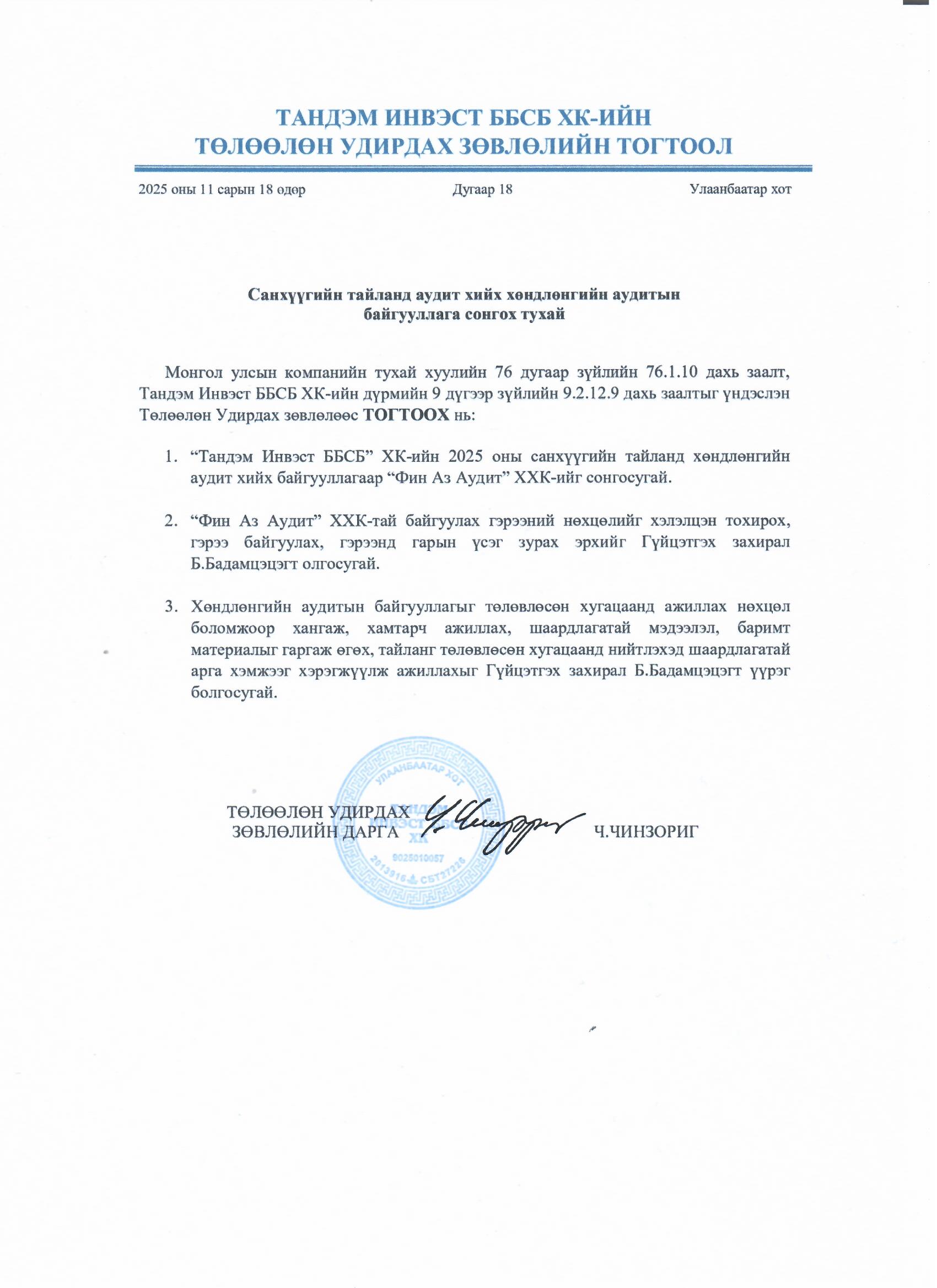 | TAND | 2025-11-06 | Тандэм инвэст ББСБ ХК | ТУЗ-ийн хурлын шийдвэр |