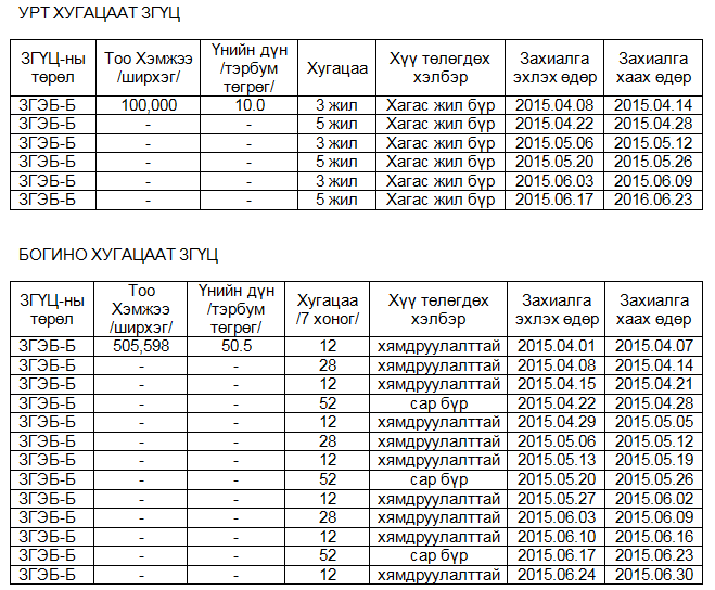 Урт хугацаат ЗГҮЦ-ны купоны төлбөр нь жил бүрийн 2 дугаар сарын 15 болон 8 дугаар сарын 15, эсхүл 5 дугаар сарын 15 болон 11 дүгээр сарын 15-ны өдрүүдэд хийгдэх болно.