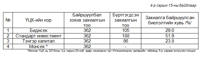 “Итгэмжлэгдсэн дилер” үнэт цаасны компаниуд арилжааны өдөр бүр ЗГҮЦ худалдах, худалдан авах үнийн саналыг давхар гаргах бөгөөд 4-р сарын 1-15-ны хооронд нийт 362 захиалга байршуулахаас, биелэлтийн хувиар авч үзэхэд “Бидисек ҮЦК”-н хувьд 29%, “Стандарт инвестмент ҮЦК”-н хувьд 51.9%, “Тэнгэр капитал ҮЦК”-н хувьд 23.8% тус тус байна.
