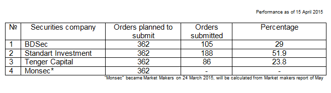 As of 15 April 2015, total of 362 order of the Government retail bonds have been planned to submit and performance of Market Makers shows following results “BDSec”-29%, “Standart Investment”-51.9% and “Tenger Capital”-23.8%