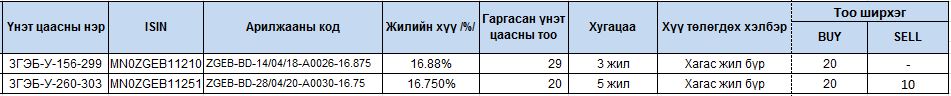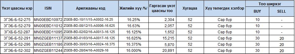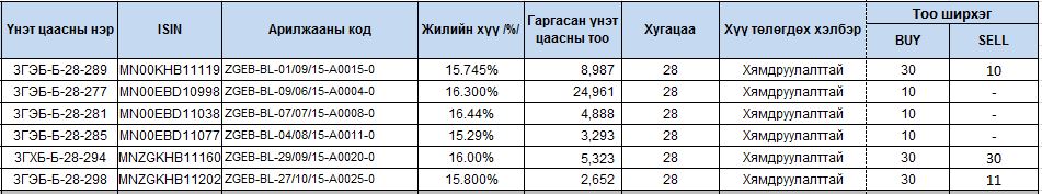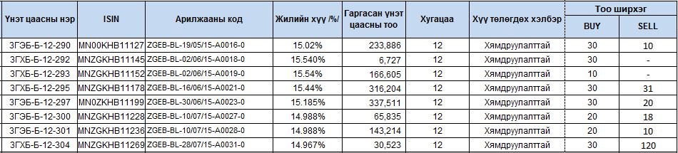 2015 оны 5 дугаар сарын 13-ны өдрийн байдлаар ЗГҮЦ-ны хоёрдогч зах зээл дээр худалдах болон худалдан авах захиалгыг доорх хүснэгтээс харна уу.