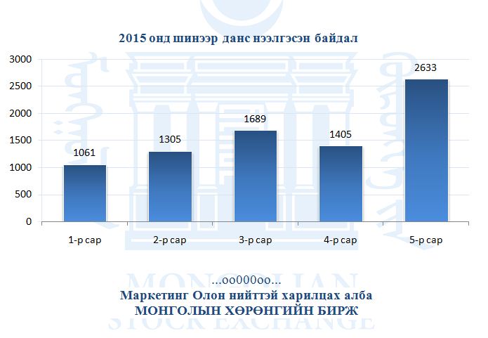 Мөн арилжааны идэвх нэмэгдэж байгаагийн хэрээр 2015 оны эхнээс 5 сарын 31-ний хүртэлх хугацаанд шинээр 8,093 үнэт цаасны арилжааны данс шинээр нээгдэж, хөрөнгийн зах зээл дээр шинэ тоглогчид нэмэгджээ.
