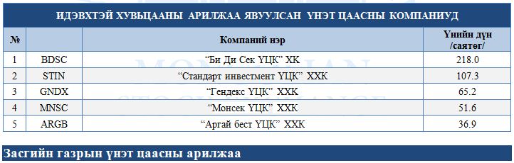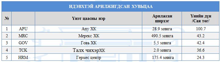 Арилжааны үнийн дүнгээр “Апу ХК” /100.7 сая төгрөг/, “Мерекс ХК” /43,2 сая төгрөг/, “Говь ХК” /42.4 сая төгрөг/, “Талх чихэр ХК” /36.6 сая төгрөг/“ Гермес центр ХК” /24.4 сая төгрөг/ зэрэг ХК-ийн үнэт цааснууд идэвхтэй арилжигджээ.