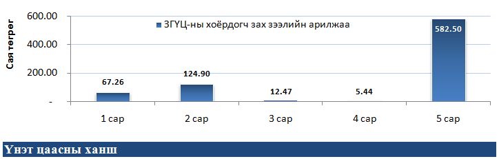 Энэ сард Засгийн газрын үнэт цаасны анхдагч зах зээлийн арилжаа 4 удаа явагдаж, 12, 28, 52 долоо хоног болон 3 жилийн хугацаатай нийт 295.3 мянган ширхэг үнэт цаасыг 28.5 тэрбум төгрөгөөр арилжсан байна. Мөн хоёрдогч зах зээлийн арилжаагаар 5,896 ширхэг үнэт цаасыг 582.5 сая төгрөгөөр арилжсан байна.