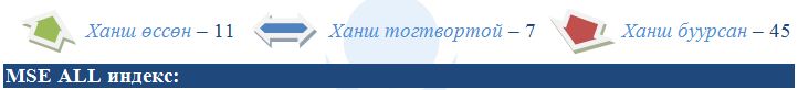 Нийт 63 үнэт цаас арилжигдсанаас өмнөх сарын сүүлийн өдрийн хаалтын ханштай харьцуулахад 11 үнэт цаасны ханш өсч, 45 үнэт цаасны ханш буурч, 7 үнэт цаасны ханш тогтвортой байлаа.