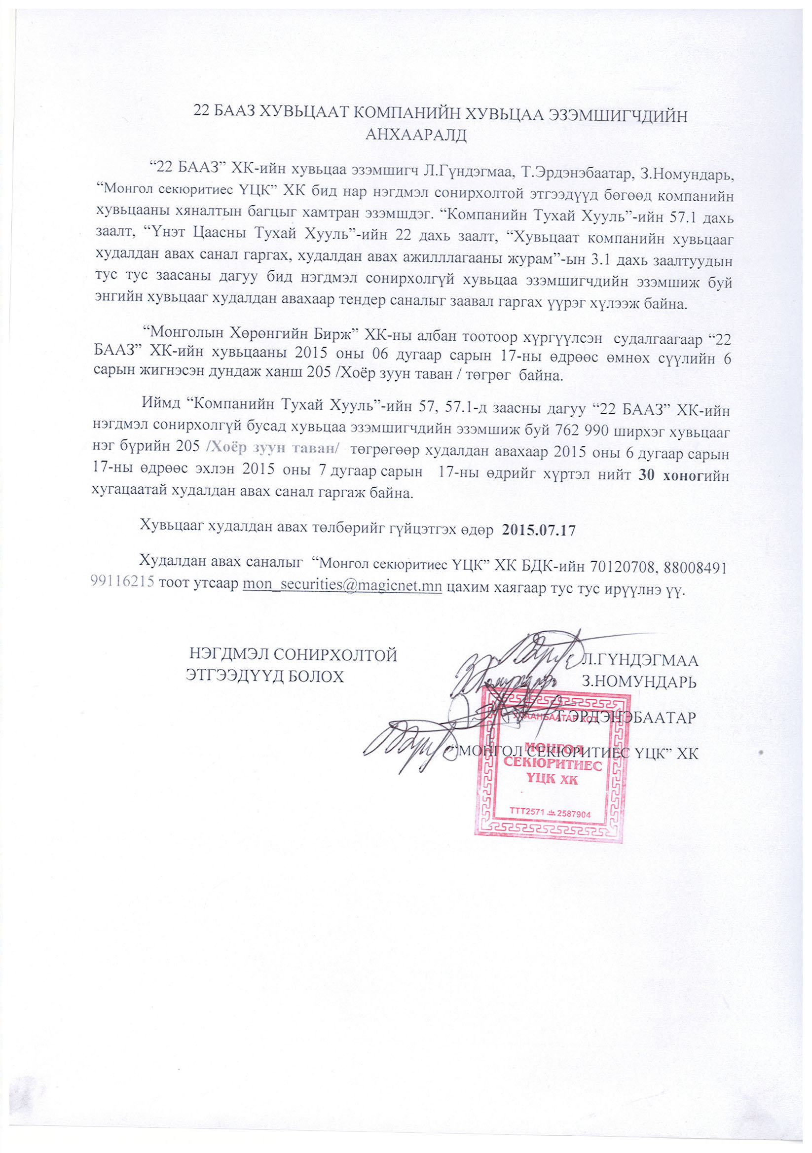 “ХОРИНХОЁРДУГААР БААЗ” ХК-ийн нэгдмэл сонирхолтой этгээдүүд “Компанийн Тухай Хууль”-ийн 57.1 дахь заалт, “Үнэт Цаасны Зах Зээлийн Тухай Хууль”-ийн 22 дахь заалт, “Хувьцаат компанийн хувьцааг худалдан авах санал гаргах, худалдан авах ажиллагааны журам”-ын 3.1 дахь заалтуудад тус тус заасны дагуу нэгдмэл сонирхолгүй энгийн хувьцаа эзэмшигчдийн эзэмшиж буй 762 990 ширхэг хувьцааг, нэг бүрийн 205 / хоёр зуун таван / төгрөгөөр худалдан авахаар энэ оны 7 дугаар сарын 17-ны өдрийг хүртэл 30 хоногийн хугацаатай худалдан авах санал зарлаад байна.