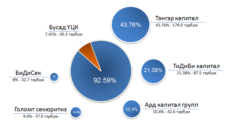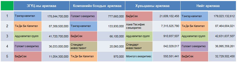2015 онд гишүүн ҮЦК-иудын бүртгэлд өөрчлөлт гараагүй бөгөөд, 43 ҮЦК арилжаанд оролцсоноос 8 сарын 25-ны байдлаар нийт арилжааны дүнгээрээ тэргүүлсэн эхний 5 ҮЦК нийт арилжааны 97 хувийг гүйцэтгэсэн байна.