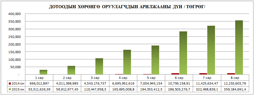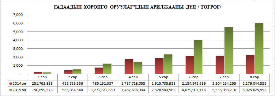 2015 оны найман сарын байдлаар гадаадын хөрөнгө оруулагчдын арилжааны дүн өмнөх оны мөн үетэй харьцуулахад 2.7 дахин өсөж 6,025,625,952 төгрөгт хүрчээ. Мөн дотоодын хөрөнгө оруулагчдын арилжааны дүн өмнөх оны мөн үетэй харьцуулахад 29.3 дахин өсөж 359,184,691,472 төгрөгт хүрч гадаад, дотоодын хөрөнгө оруулалт нэмэгдсэн байна.