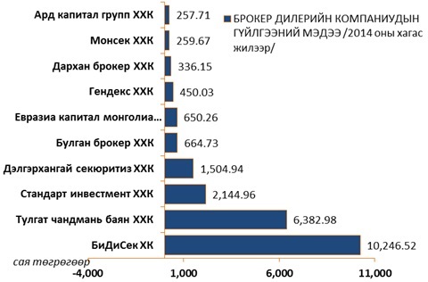 2014 оны эхний хагас жилийн байдлаар нийт 127 удаагийн арилжаагаар 123 компанийн 29.9 сая ширхэг хувьцааг 12.9 тэрбум төгрөгөөр арилжааллаа.  Арилжааны хэмжээг өмнөх оны мөн үетэй харьцуулбал хувьцааны арилжааны үнийн дүн 604.8 сая төгрөгөөр буюу 4.9 хувиар өссөн байна.